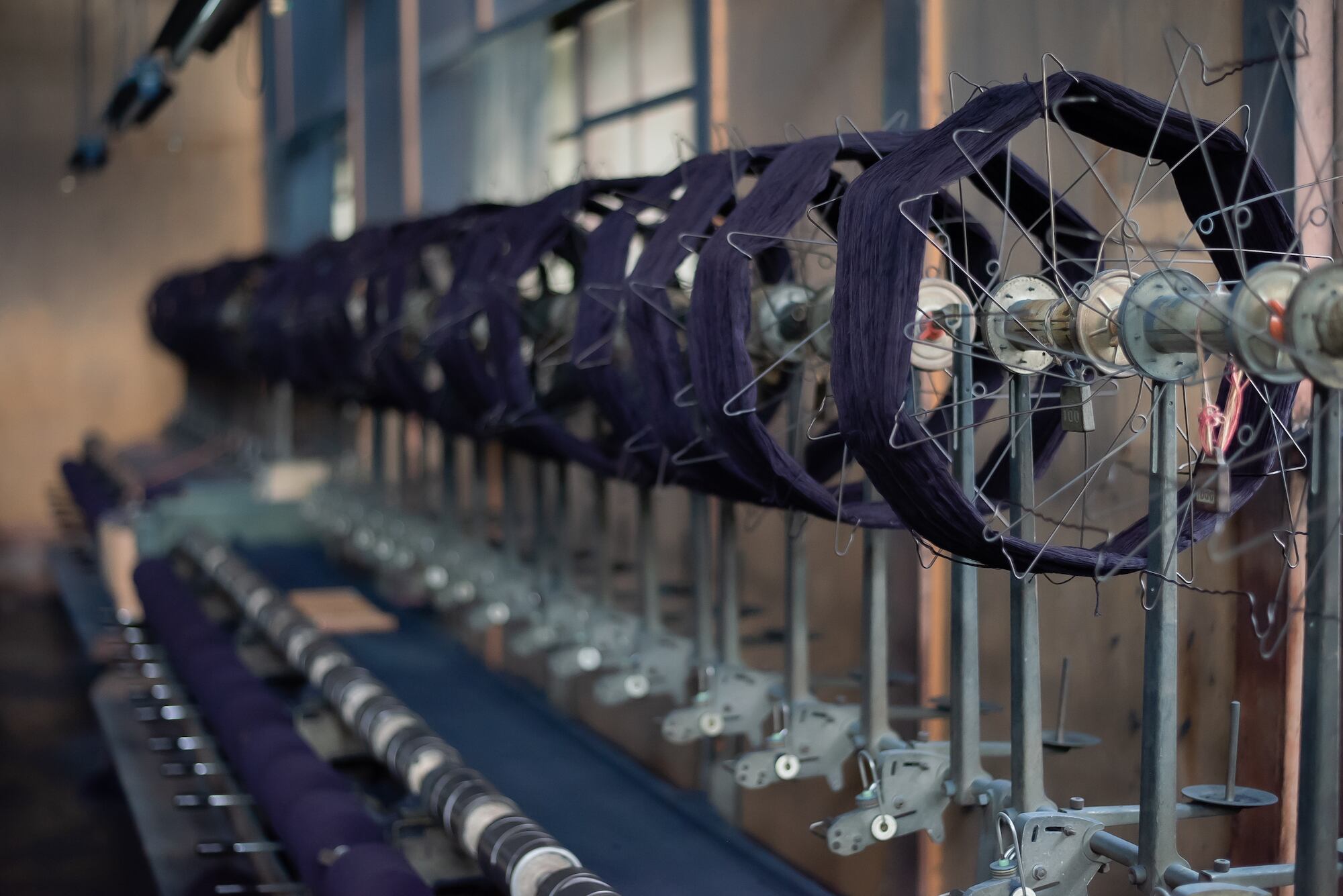 職人が四季折々の気候や気温を肌で感じながら根気よく愛情をかけて世話をし、その藍で糸を染めた後、シャトル織機を使って生地を織り上げていきます。